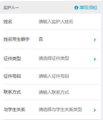 1.系统在家长输入完学生信息后,系统将自动填写学生监护人的部分信息,家长自行将信息补充完整。2.如果系统自动填写的监护人信息有误,家长也可以根据实际情况修改或者删除由系统自动填写的监护人信息,系统允许只填写一位监护人,但“监护人一”必须填写,不能放空。