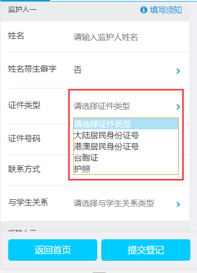 3.港澳台侨外的监护人信息无法自动填写,需要家长自行填写完整。监护人为港澳居民的选择填写“港澳居民身份证号”,监护人为台湾居民的选择填写“台胞证”号,监护人为华侨、外籍的选择填写“护照”号。