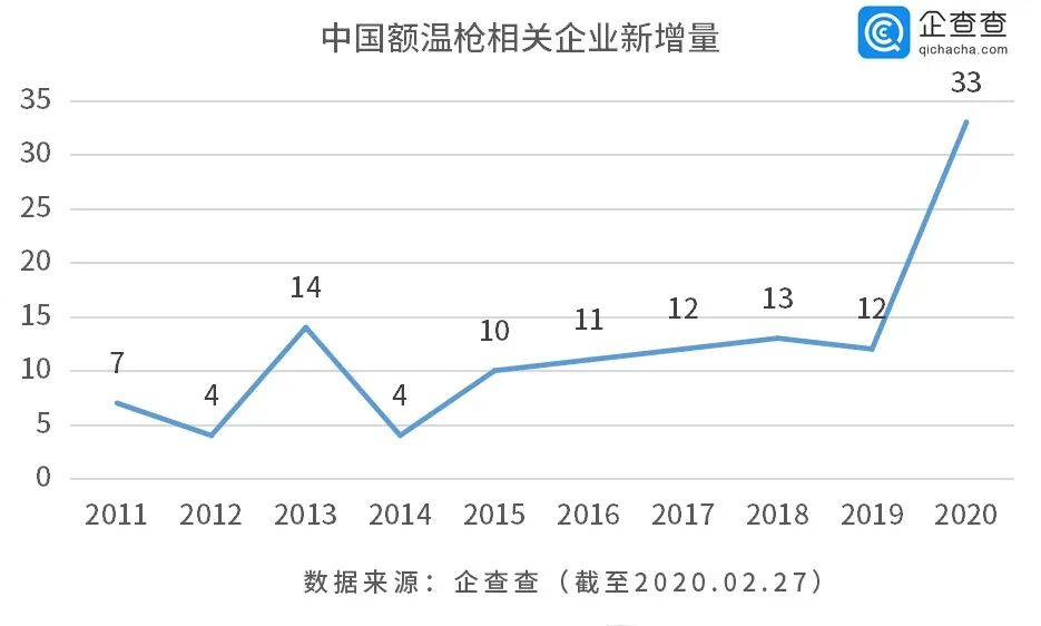 企查查数据显示,全国生产、销售额温枪的企业仅有156家,规模以上企业仅44家。受疫情影响,2020年新增额温枪企业数量达到33家,创近10年来新高。
