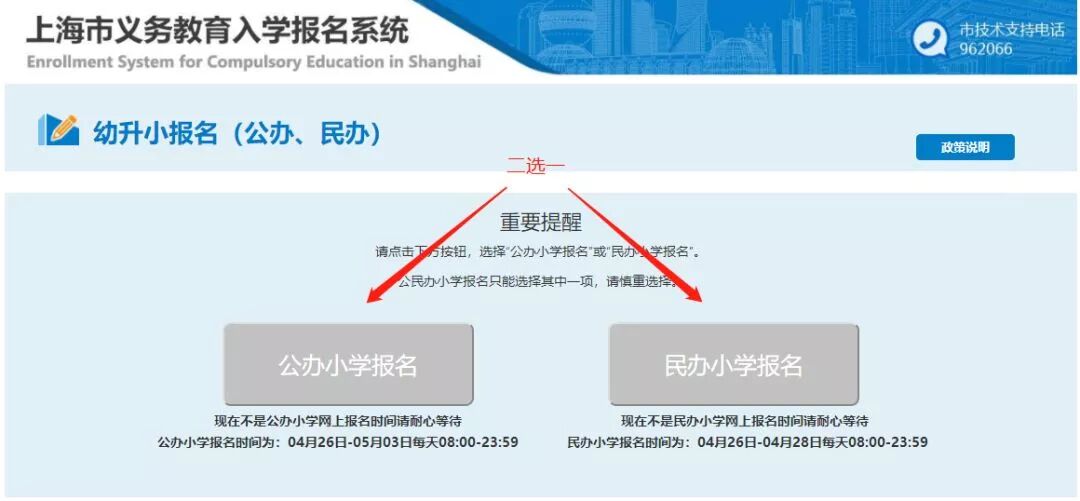 ▲注意:公民办小学报名只能选择其中一项,请慎重选择。