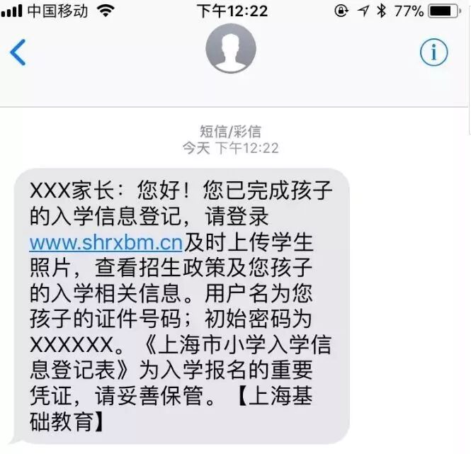 4月8日起,完成入学信息登记后,家长可通过手机获取短信:XXX家长:您好!您已完成孩子的入学信息登记,请及时上传学生照片,查看招生政策及您孩子的入学相关信息。用户名为您孩子的证件号码;初始密码为XXXXXX。《上海市小学入学信息登记表》为入学报名的重要凭证,请妥善保管。家长也可使用短信中告知的登录账号以及初始密码,登录入学报名系统查询“幼升小”的相关信息。