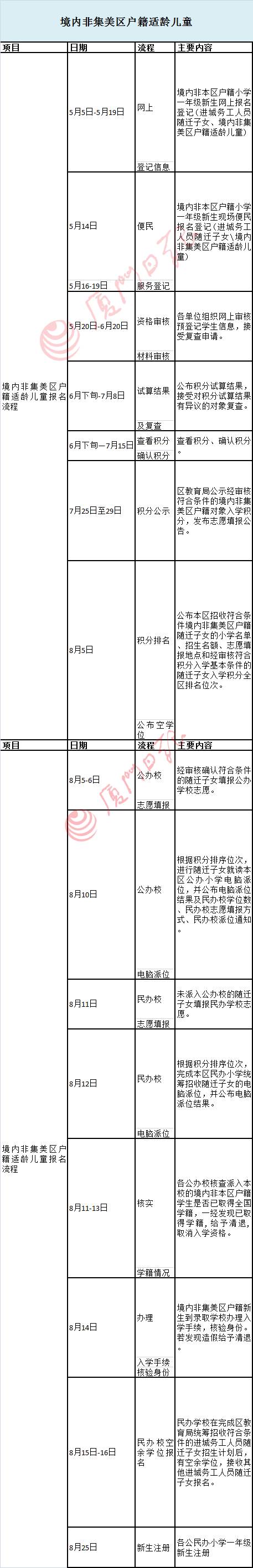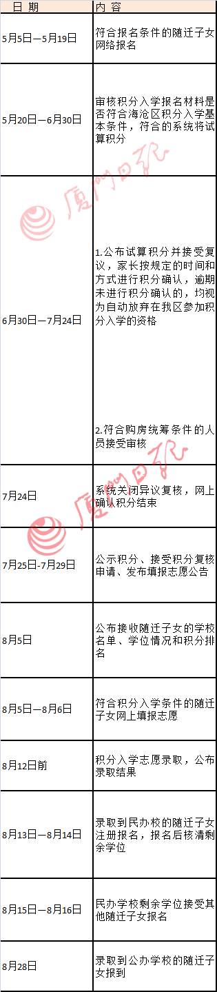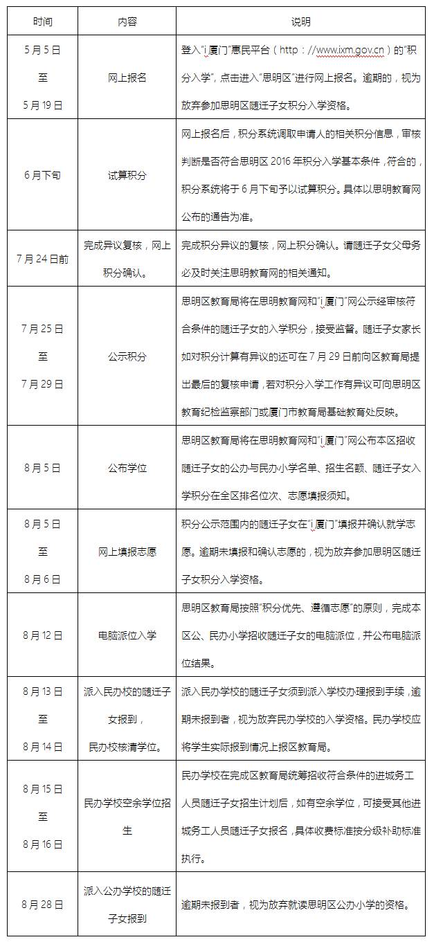 系统自主调取申请人的暂住、缴交社会保险、符合计划生育政策等信息进行审核并试算积分,同时以短信通知家长登录系统进行积分确认。 学生家长如对材料审核情况有异议可于6月20日前通过i厦门积分入学平台提出复核申请,并上传相关证明材料,逾期不予受理。教育部门将于6月下旬公布积分试算结果及积分确认方式,逾期未进行积分确认的,视为自动放弃在我区参加积分入学的资格。申请人如对积分试算结果有异议,可于积分试算结果公布之日起至7月8日前在网上直接申请复查,逾期不予受理;申请人如对积分试算结果无异议,应及时进行积分确认。 7月25日至7月29日,区教育局组织审核,对符合条件的申请人按照积分由高分到低分进行排序,并公示5天,接受监督。 8月5日,区教育局根据招生计划对全区义务教育阶段公办学校的学位数进行统计,在招收本区户籍学生后,结合本区实际,核算出可接收随迁子女入学的公民办义务教育学校及其学位数并公布。 志愿填报 8月5日至8月6日,组织经确认、符合积分入学条件的申请人在网上填报入学志愿。 8月12日前,按照“积分优先、遵循志愿”的原则,对符合条件的随迁子女根据积分排序位次和填报的志愿顺序,派位或安排入学,结果向社会公布。 公布学位。8月5日,核算并公布招收随迁子女的学校及学位数。 派位入学。8月12日前,按照“积分优先、遵循志愿”原则,随迁子女电脑派位,公布派位结果。