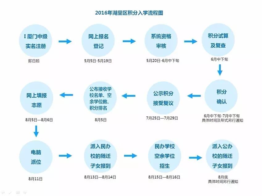 报名人数再创新高 这一数字再创新高,去年报名人数是24311,比去年多了2492人。各区的报名数据分布是: 区 2016年 2015年 思明 4375 4349 湖里 7366 6790 集美 6768 6445 海沧 3582 3152 同安 3698 2965 翔安 1014 610 总数 26803 备注:不含报了名,但未提交数 报了名就能被录取吗? 报了名就能被录取吗?答案是否定的,从往年看,还是会有一些人不符合基本条件,但是也报了名。 那么,符合基本条件的,就能被录取?去年符合基本条件的,都会被录取,但是,今年情况尚不明朗,必须等到8月1日,本市户籍报名结束后,才会有答案。只要在小学报名结束前8月1日,将户籍转入厦门,就可以在厦门上学,因此,数据要等到最后一刻才知道。 报了名,要做什么? 咱们一个区一个区说~ 各位请仔细看,拿出小本本记好啦! 积分入学工作流程: 主要是网上报名、资格审核、试算积分、异议复核、公示积分、公示学位、网上填报志愿、电脑派位、报到入学,具体如下: 猛戳图片放大看更清晰☟ 猛戳图片放大看更清晰☟ 猛戳图片放大看更清晰☟