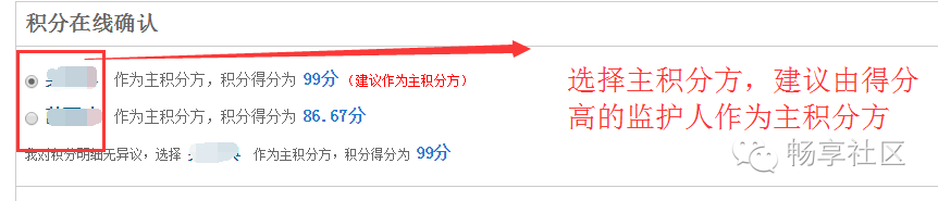家长需要自行选择监护人一还是监护人二作为主积分方,选择一方后,则另一方就自动成为附加分方,建议选择得分高的监护人作为主积分方。