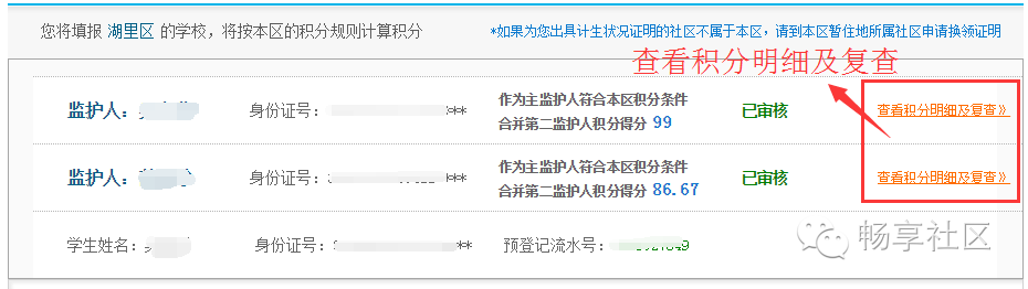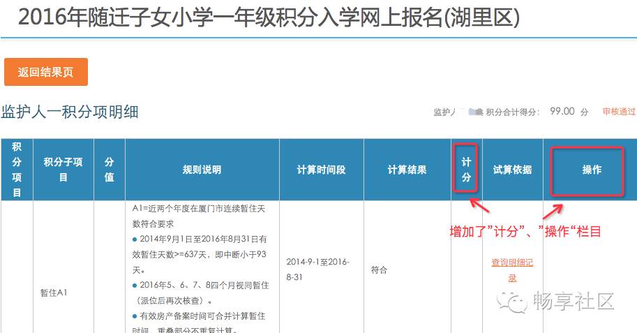 这个时候页面上已经增加了“计分”、“操作”两栏,针对各项积分,家长还可点击“查询明细记录”,查看到系统从公安、社保部门读取的每一笔暂住、社保记录。