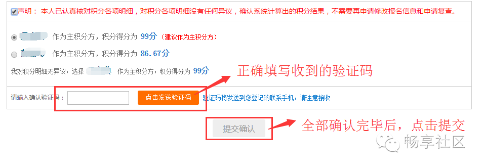 在家长把各项积分都确认完毕后,勾选上“声明”,并最后一遍确认选择哪个监护人作为主积分方,之后“点击发送验证码”,系统会自动发送验证码到您之前注册时所填写的手机号上,家长收到验证码后,输入正确的验证码。