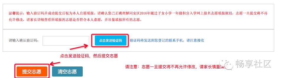 进入系统后,可以看到积分确认单,请点击“点击此处填报志愿”,如下图所示: 进入志愿填报页面,右上角可以看到您的积分及在同安区的全区排名。 在开始填报志愿前,请务必阅读《同安区志愿填报规则》及《同安区派位学校及学位情况》。 主志愿片区默认根据报名时所填写的现居住地选择片区,家长无法进行修改。 根据《同安区志愿填报规则》,同安区只需填报1个志愿,系统会把家长报名登记时选择的登记点学校作为默认志愿学校,如下图所示: 若家长想要更换志愿学校,可点击志愿框右边的“X”,所填学校就会取消,然后您可再次重新选择学校,如下图所示: 家长可根据自身情况(例如您的实际居住地、上下学交通安全、积分排名情况、学校剩余学位情况)选择志愿学校。如下图所示: 确定志愿学校后,请选择“是否愿意服从公办校志愿调剂”,如下图所示: 志愿填写完成后,点击发送验证码,填写正确验证码后,最后再确认所填志愿无误后,请点击【提交志愿】按钮完成提交。 志愿一旦提交后就不允许修改,请慎重操作,如下图所示: 志愿填报成功后,页面上方会显示您提交成功的提示,并于8月12日登录网站查询录取结果,如下图所示: