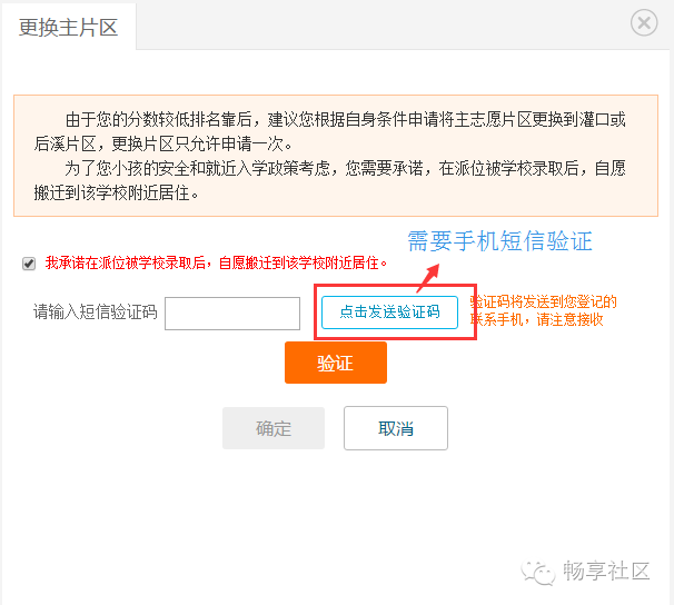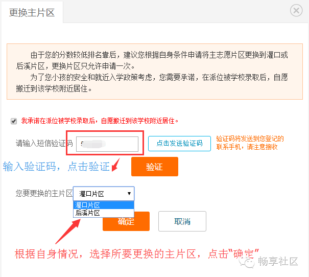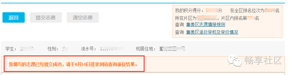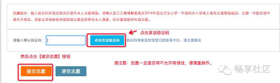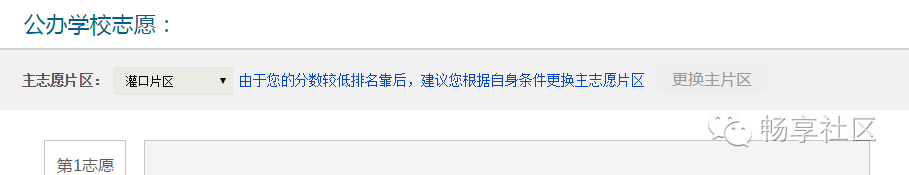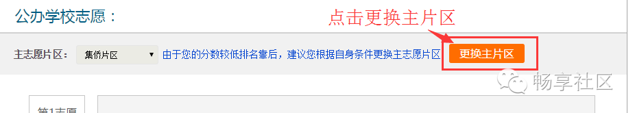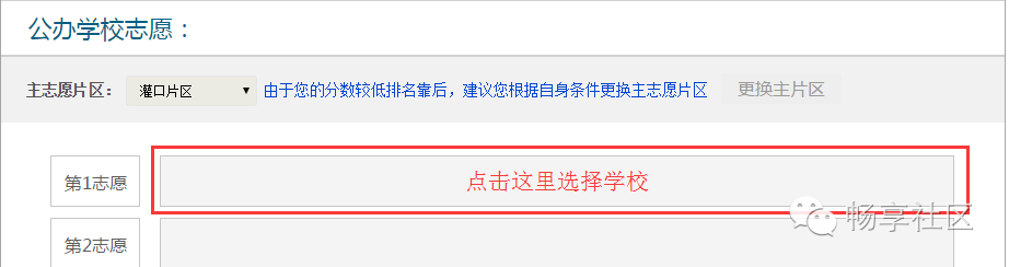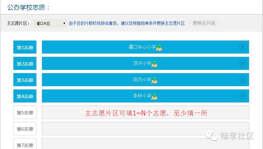 登录后,点击“首页”—“积分入学”,选择“集美区”,然后点击“志愿填报及结果查询”,如下图所示: 进入系统后,可以看到积分确认单,请点击“点击此处填报志愿”,如下图所示: 进入志愿填报页面,右上角可以看到您的积分及在集美区的全区排名。 在开始填报志愿前,请务必阅读《集美区志愿填报规则》及《集美区派位学校及学位情况》。 在8月5日、6日填报的是公办学校志愿。 如果片区内排名不低于片区内空余学位数,主志愿片区默认为报名时暂住证地址所在片区,无法获取暂住证地址,默认为所填写的暂住地所在片区,家长不可修改,如下图所示: 如果片区内排名低于片区内空余学位数,例如居住地在集侨片区的,则可以申请将主片区更换到灌口或后溪片区。 不过需要注意的是:家长此时是无法知道自己更换片区后,在该片区的排名的。 如下图所示,点击“更换主片区”按钮。 申请更换主片区要求家长做出承诺,勾选“我承诺...”,输入短信验证码后点击【验证】,如下图所示: 手机验证通过后,请根据自身条件,更换主志愿片区为“灌口片区”或“后溪片区”,然后点击【确定】按钮,如下图所示: 请注意:主片区只允许更换一次,一旦更换主片区后,该按钮就会变灰不可再修改或改回来,请谨慎操作。 填报公办学校志愿。请按照志愿顺序,点击灰框选择学校,如下图所示: 家长可根据自身情况(例如您的实际居住地、上下学交通安全、积分排名情况、学校剩余学位情况)在该片区内选择公办学校,如下图所示: 已选志愿如果想要修改,可点击右侧的“X”,所填学校就会取消,然后您可再次重新选择学校,同时可点击学校名称后面的“地址”图标,可以查看学校位置。如下图所示: 同理,请逐个填报其余剩下志愿,根据《集美区志愿填报规则》,主片区志愿可填1到N个,即家长必须在主片区填报至少一所学校,可以选满也可以不选满。 请家长根据积分排名情况,自行选择学校的志愿顺序,如下图所示: 除主片区外,可在其他4个片区中任意选择一个片区作为副片区,副片区可填0到N个志愿。 家长先选择副片区后在副片区的所有学校中选择学校填报,可以填满也可以不填满或者不填,填报方法同主志愿片区,如下图所示: 所有志愿填写完成后,点击发送验证码,填写正确验证码后,最后再确认所填志愿无误后,请点击【提交志愿】按钮完成提交。 志愿一旦提交后就不允许修改,请慎重操作,如下图所示: 志愿填报成功后,页面上方会显示您提交成功的提示,并于8月10日登陆网站查询录取结果,如下图所示: 符合积分入学条件的进城务工人员随迁子女,若未被派入公办校,可申请就读我区合法民办校。