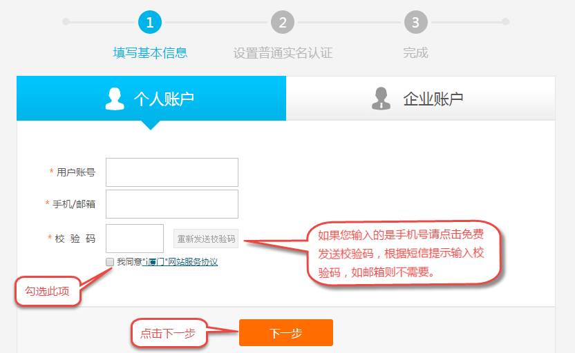 ③校验码:点击免费发送后,输入手机收到的校验码;