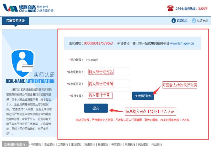 ⑦填写中级实名注册认证基本信息:身份证姓名、身份证号、银行卡号(特别提醒:“i厦门”不保存家长银行卡信息,只用于身份信息校验,不影响家长的银行卡安全);