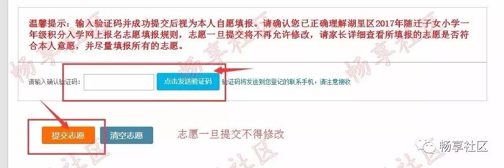 请家长用自己的注册帐号和密码登录“i厦门惠民平台”(www.ixm.gov.cn)填报志愿,逾期未填报志愿的视为自动放弃参加湖里区积分入学电脑派位资格。 今年志愿填报可在“i厦门”网站进行,也可通过“i厦门”微信公众号进行志愿填报。 如果忘记登陆密码,可在“i厦门”网站通过手机号+验证码的方式进行密码重设。 本次志愿填报规则参考中、高考的“平行志愿”规则进行,按照“积分优先、遵循志愿”的原则,根据积分排序位次,完成随迁子女的志愿派位录取工作。 有关2017年湖里区志愿填报规则和填报要求,请查看湖里区教育局官网发布的《湖里区2017年积分入学志愿填报的公告》,也可点击“畅享社区”微信公众号的《湖里区2017年积分入学志愿填报办法》进行查看。 请家长务必在填报志愿前,仔细认真阅读志愿报名规则,谨慎科学地填报本次志愿。 在电脑浏览器访问“i厦门惠民平台”(http://www.ixm.gov.cn/),点击右上角“登录”如下图所示: 在登录处输入帐号和密码,然后点击【点击登录】按钮,如下图所示: 如果忘记密码,请点击“找回密码”,然后通过“手机号+验证码”的方式重设密码。 登录后,点击“首页”—“积分入学”,选择“湖里区”,然后点击“志愿填报及结果查询”,如下图所示: 进入系统后,可以看到积分确认单,请点击“点击此处填报志愿”,如下图所示: 进入志愿填报页面,右上角可以看到您的积分及在湖里区的全区排名。 在开始填报志愿前,请务必阅读《湖里区志愿填报规则》及《湖里区派位学校及学位情况》。 填报公办学校志愿。 请按照志愿顺序,点击灰框选择学校,如下图所示: 家长可根据自身情况(例如您的实际居住地、上下学交通安全、积分排名情况、学校剩余学位情况)选择公办学校。如下图所示: (具体学校请以系统为准 ,上图仅供参考) 已选志愿如果想要修改,可点击右侧的“X”,所填学校就会取消,然后您可再次重新选择学校,如下图所示: 同理,请逐个填报其余剩下志愿,根据《湖里区志愿填报规则》,公办志愿学校必须全部填满,不可重复选。 请家长根据自身情况谨慎选择学校的志愿顺序,如果没有填满,系统将无法提交,如下图所示: 填满7个公办志愿后,请选择“是否愿意服从公办校志愿调剂”,如下图所示: 填报完公办的志愿后,填报4个民办志愿,填报方法同上。 4个民办志愿填报完后,系统自动选择愿意服从民办校志愿调剂,无需自己点击。 所有志愿填写完成后,点击发送验证码,填写正确验证码后,最后再确认所填志愿无误后,请点击【提交志愿】按钮完成提交。 志愿一旦提交后就不允许修改,请慎重操作,如下图所示: 志愿填报成功后,页面上方会显示您提交成功的提示,并于7月20日20点后登录网站查询派位结果,如下图所示: 温馨提示 1、请于7月20日20点后电脑派位后登陆网站查询派位结果,具体查看方法请留意“湖里区教育局官网”(http://www.hledu.gov.cn)“招生专栏”或湖里教育局官方微信公众号“hulijiaoyu2015”发布的通知,也可以留意“畅享社区”微信公众号推送的消息。 2、网上填报志愿有且只有7月14日、15日两天时间,特别提醒:报名截止时间是7月15日16:00,逾期未填报志愿的视为自动放弃参加湖里区积分入学电脑派位资格。 3、购房户在同分时优先派位,系统会提示同分共并列多少人。 4、各位家长在填报志愿时,请根据暂住地、积分排名位次和湖里区可接受电脑派位的公、民办小学学位情况综合考量,有梯度的填报志愿。 5、不要盲目跟风,不要都填报学位少的学校,可以适当选择一些学位较多的学校,避免志愿扎堆现象,切忌填写您没有意向就读的学校。 6、提交志愿报名时间先后与最终派位结果无关,家长不必急于提交志愿,志愿一旦提交后就不允许修改,请慎重操作。 7、所有申请人须填满11个志愿,如未填满,将无法在系统提交志愿。。 8、申请人的排名在公办校学位数范围内(如公办校学位1000个,申请人排名小于等于1000),选择愿意服从公办校调剂的则确保可以派入公办校,如果申请人选择不愿意服从公办校调剂,则有可能被派到民办学校。 是否愿意服从公办校调剂,家长可自愿选择。 8、所有人的民办校调剂都是系统自动选择“愿意”。 9、因学校和生源分布不均衡,分数较低的随迁子女可能录取到距离居住地较远的学校,为确保交通安全,建议开学前将居住地迁到录取学校附近。 10、若均未被区内任何学校录取,请尽快回原户籍地就学。 11、无法或不会在网上进行志愿填报的家长可以在7月14日携带身份证、户口本、手机到湖里区行政服务中心积分入学窗口寻求帮助,具体地址为: