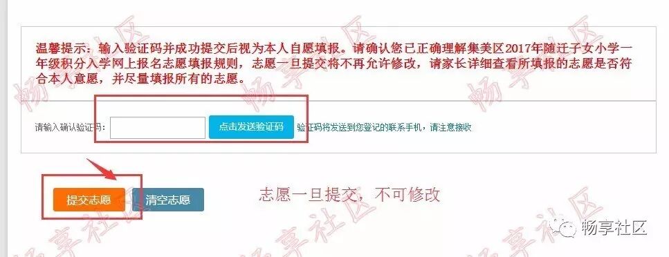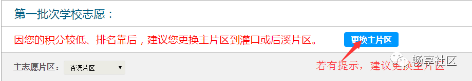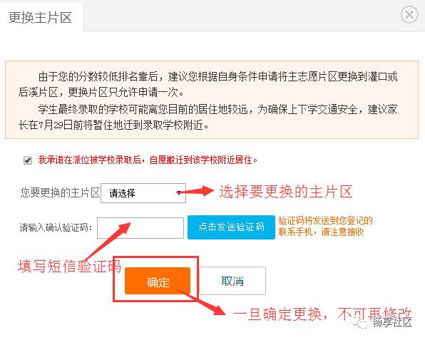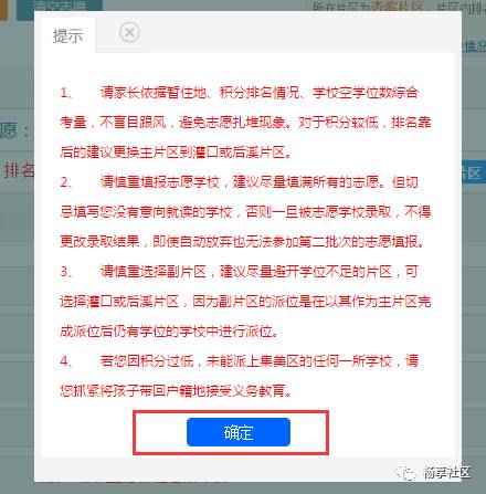 请家长用自己的注册帐号和密码登录“i厦门惠民平台”(www.ixm.gov.cn)填报志愿。 今年志愿填报可在“i厦门”网站进行,也可通过“i厦门”微信公众号进行志愿填报。 如果忘记登陆密码,可在“i厦门”网站通过“手机号+验证码”进行密码重设。 有关2017年集美区志愿填报规则和填报要求,请查看集美区教育局《集美区2017年积分入学志愿填报和积分派位规则》发布的公告,也可查看“畅享社区”微信公众号的《集美区2017年积分入学志愿填报办法》。 请家长务必在填报志愿前,仔细认真阅读志愿报名规则,谨慎科学地填报本次志愿。 在电脑浏览器访问“i厦门惠民平台”(http://www.ixm.gov.cn/),点击右上角“登录”如下图所示: 在登录处输入帐号和密码,然后点击【点击登录】按钮,如下图所示: 如果忘记密码,请点击“找回密码”,然后通过“手机号+验证码”的方式重设密码。 登录后,点击“首页”—“积分入学”,选择“集美区”,然后点击“志愿填报及结果查询”,如下图所示: 进入系统后,可以看到积分确认单,请点击“点击此处填报志愿”,如下图所示: 点击进入后,系统会有个弹窗提示,请仔细阅读,阅读完后点击最下方的【确定】按钮。 进入志愿填报页面,右上角可以看到您的积分及在集美区的全区排名。 在开始填报志愿前,请务必阅读《集美区志愿填报规则》及《集美区派位学校及学位情况》。 如果片区内排名不低于片区内空余学位数,系统默认获取家长积分确认时所选择的现居住地所在片区作为主志愿片区,家长不可修改,如下图所示: 如果片区内排名低于片区内空余学位数,例如居住地在集侨片区的,则可以申请将主片区更换到灌口或后溪片区。 不过需要注意的是:家长此时是无法知道自己更换片区后,在该片区的排名的。 如下图所示,点击“更换主片区”按钮。 申请更换主片区要求家长做出承诺,勾选“我承诺...”,请根据自身条件,更换主志愿片区为“灌口片区”或“后溪片区”,点击【发送验证码】,输入短信验证码后,确定更换点击【确定】按钮,如下图所示: 请注意:主片区只允许更换一次,一旦更换主片区后,不可再修改或改回来,请谨慎操作。 填报公办学校志愿。请按照志愿顺序,点击灰框选择学校,如下图所示: 家长可根据自身情况(例如您的实际居住地、上下学交通安全、积分排名情况、学校剩余学位情况)在该片区内选择公办学校,如下图所示: 已选志愿如果想要修改,可点击右侧的“X”,所填学校就会取消,然后您可再次重新选择学校,同时可点击学校名称后面的“地址”图标,可以查看学校位置。如下图所示: 同理,请逐个填报其余剩下志愿,根据《集美区志愿填报规则》,主片区志愿可填1到N个,即家长必须在主片区填报至少一所学校,可以选满也可以不选满。 请家长根据积分排名情况,自行选择学校的志愿顺序,如下图所示: 除主片区外,可在其他4个片区中任意选择一个片区作为副片区,副片区可填0到N个志愿。 家长先选择副片区后在副片区的所有学校中选择学校填报,可以填满也可以不填满或者不填,填报方法同主志愿片区,如下图所示: 所有志愿填写完成后,点击发送验证码,填写正确验证码后,最后再确认所填志愿无误后,请点击【提交志愿】按钮完成提交。 志愿一旦提交后就不允许修改,请慎重操作,如下图所示: 志愿填报成功后,页面上方会显示您提交成功的提示,并于7月20日登陆网站查询录取结果,如下图所示: 符合积分入学条件的进城务工人员随迁子女,若未被派入公办校,可申请就读我区合法民办校。 温馨提示 1、7月20日,对符合条件的随迁子女根据积分排序位次和填报的志愿顺序,以电脑派位的方式安排入学,派位结果将于7月20日向社会公布。 2、7月22日,对第一批次未录取且参加第二次志愿填报的学生进行第二次派位,家长们可于7月22日登录网站查询录取结果。 3、当存在同分时,将根据购房、社保、暂住、计生进行同分排序,若按上述项目同分排序后积分名次仍相同的,则按随机原则排序。 4、请家长依据暂住地、积分排名情况、学校剩余学位数综合考量,不盲目跟风,避免志愿扎堆现象。 5、公办校、民办校志愿建议您尽量填满,切忌填写您没有意向就读的学校,否则一旦被志愿学校录取,不得更改录取结果。 6、在主片区派位后,因积分不足,无法在主片区录取的,则进入副片区派位,但需在以该片区作为主片区的派位完成后仍有空余学位的学校中进行二次派位。 7、提交志愿报名时间先后与最终派位结果无关,家长不必急于提交志愿,志愿一旦提交后就不允许修改,请慎重操作。 8、学生最终录取的学校可能离您目前的居住地较远,为确保上下学交通安全,建议家长在开学前将暂住地迁到录取学校附近。 9、若均未被区内任何学校录取,请尽快回原户籍地就学。 10、被派入公小学的进城务工人员随迁子女应于7月20日下午(周四)持户口本(原件、复印件1份A4纸复印户口本首页和学生本页、监护人本页)及身份证等相关证明材料到录取学校办理入学手续(不携带孩子)。 11、被派入民办小学的进城务工人员随迁子女应于7月23日上午(周日)持户口本(原件、复印件1份A4纸复印户口本首页和学生本页、监护人本页)及身份证等相关证明材料到录取学校办理入学手续(不携带孩子)。 12、派位结果不得更改,逾期未办理入学手续的,视为自动放弃入学