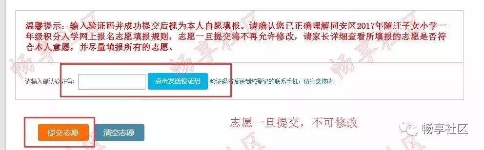请家长用自己的注册帐号和密码登录“i厦门惠民平台”(www.ixm.gov.cn),依据片区内(以现居住地所属镇、街为片区)学校学位剩余数、积分排名进行网上志愿填报。 今年志愿填报可在“i厦门”网站进行,也可通过“i厦门”微信公众号进行志愿填报。 如果忘记登陆密码,可在“i厦门”网站通过手机号+验证码的方式进行密码重设。 本次志愿填报规则参考中、高考的“平行志愿”规则进行,按照“积分优先、遵循志愿”的原则,根据积分排序位次,完成随迁子女的志愿派位录取工作。 有关2017年同安区志愿填报规则和填报要求,请点击查看同安区教育局官网发布的《同安区积分入学志愿填报办法》,也可点击“畅享社区”微信公众号的《同安区2017年积分入学志愿填报办法》栏目查看。 请家长务必在填报志愿前,仔细认真阅读志愿报名规则,谨慎科学地填报本次志愿。 在电脑浏览器访问“i厦门惠民平台”(http://www.ixm.gov.cn/),点击右上角“登录”如下图所示: 在登录处输入帐号和密码,然后点击【点击登录】按钮,如下图所示: 如果忘记密码,请点击“找回密码”,然后通过“手机号+验证码”的方式重设密码。 登录后,点击“首页”—“积分入学”,选择“同安区”,然后点击“志愿填报及结果查询”,如下图所示: 进入系统后,可以看到积分确认单,请点击“点击此处填报志愿”,如下图所示: 此图仅供参考 进入志愿填报页面,右上角可以看到您的积分及在同安区的全区排名。 在开始填报志愿前,请务必阅读《同安区志愿填报规则》及《同安区派位学校及学位情况》。 系统默认获取家长积分确认时所选择的现居住地所在片区作为志愿片区,家长无法进行修改。 根据《同安区志愿填报规则》,同安区只需填报1个志愿,如下图所示: 家长可根据自身情况(例如您的实际居住地、上下学交通安全、积分排名情况、学校剩余学位情况)选择志愿学校。如下图所示: 若家长想要更换志愿学校,可点击志愿框右边的“X”,所填学校就会取消,然后您可再次重新选择学校,如下图所示: 确定志愿学校后,请选择“是否愿意服从公办校志愿调剂”,如下图所示: 志愿填写完成后,点击发送验证码,填写正确验证码后,最后再确认所填志愿无误后,请点击【提交志愿】按钮完成提交。 志愿一旦提交后就不允许修改,请慎重操作,如下图所示: 志愿填报成功后,页面上方会显示您提交成功的提示,并于7月24日登录网站查询录取结果,如下图所示: 温馨提示 1、请于7月24日登陆网站查询派位结果,具体查看方法请留意同安区教育局官网(http://www.tajy.gov.cn/)发布的通知,也可以留意“畅享社区”微信公众号推送的消息。 2、网上填报志愿有且只有7月14日、15日两天时间,逾期未填报志愿的视为自动放弃参加同安区积分入学资格。 3、购房户在同分时优先派位,系统会提示同分共并列多少人。 4、请家长依据暂住地、积分排名情况、学校剩余学位数综合考量,不盲目跟风,避免志愿扎堆现象。 5、为确保上下学交通安全,建议家长在开学前将暂住地迁到录取学校附近居住。 6、提交志愿报名时间先后与最终派位结果无关,家长不必急于提交志愿,志愿一旦提交后就不允许修改,请慎重操作。