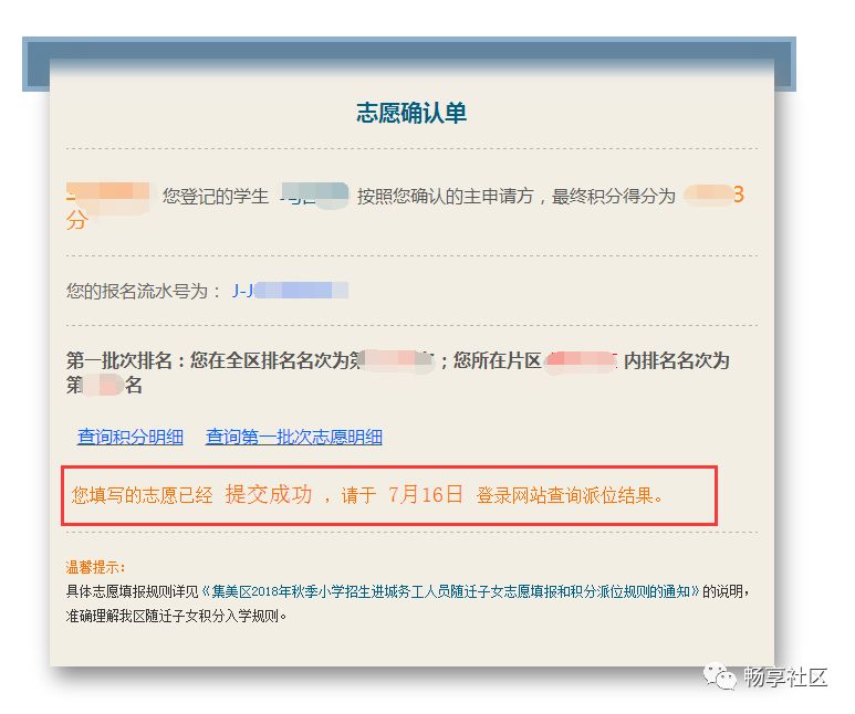 请家长用自己的注册帐号和密码登录“i厦门惠民平台”(www.ixm.gov.cn)填报志愿。 今年志愿填报可在“i厦门”网站进行,也可通过“i厦门”微信公众号进行志愿填报。 如果忘记登录密码,可在“i厦门”网站通过“手机号+验证码”进行密码重设。 有关2018年集美区志愿填报规则和填报要求,请查看集美区教育局《集美区2018年积分入学志愿填报和积分派位规则》发布的公告,也可查看“畅享社区”微信公众号的《集美区2018年积分入学志愿填报办法》。 请家长务必在填报志愿前,仔细认真阅读志愿报名规则,谨慎科学地填报本次志愿。 在开始填报志愿前,请务必阅读《集美区志愿填报规则》及《集美区派位学校及学位情况》。 如果片区内排名不低于片区内空余学位数,系统默认获取家长积分确认时所选择的现居住地所在片区作为主志愿片区,家长不可修改,如下图所示: 请按照志愿顺序,点击灰框选择学校,如下图所示: 家长可根据自身情况(例如您的实际居住地、上下学交通安全、积分排名情况、学校剩余学位情况)在该片区内选择公办学校,如下图所示: (具体学校请以志愿填报系统为准 ,此图仅供参考) 已选志愿如果想要修改,可点击右侧的“X”,所填学校就会取消,然后您可再次重新选择学校,同时可点击学校名称后面的“地址”图标,可以查看学校位置。如下图所示: 同理,请逐个填报其余剩下志愿,根据《集美区志愿填报规则》,一批次志愿可填1到N个,即家长必须填报至少一所学校,可以选满也可以不选满。请家长根据积分排名情况,自行选择学校的志愿顺序。 所有志愿填写完成后,点击发送验证码,填写正确验证码后,最后再确认所填志愿无误后,请点击【提交志愿】按钮完成提交。 志愿一旦提交后就不允许修改,请慎重操作,如下图所示: 志愿填报成功后,页面上方会显示您提交成功的提示,并于7月16日登陆网站查询录取结果,如下图所示: 符合积分入学条件的进城务工人员随迁子女,若未被派入第一批次主片区志愿录取,可参加第二批次公办校副片区志愿。家长应于7月20日登陆“i厦门”进行第二批次志愿填报,可选择1~N个志愿,可以填满也可以不填满。填报方法同第一批次志愿。 往年每批次派位完的第二天,家长就要立即到派位学校去报到,由学校统计出要留给下个批次的剩余学位数。 考虑到留给家长的时间太赶,今年集美区针对派位成功的这部分家长,将提供线上确认入学功能,家长只要在系统上确定入学即可。 不过在线确认入学是有时间限制的,请家长在规定的时间内完成确认,逾期未确认就视为放弃集美区入学资格,也不能参加下个批次的志愿填报了。