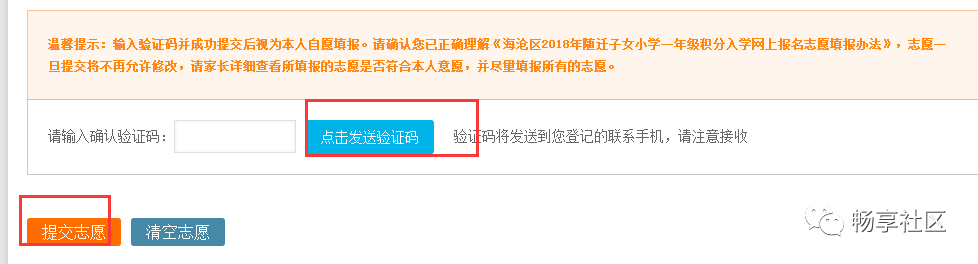 请家长用自己的注册帐号和密码登录“i厦门惠民平台”(www.ixm.gov.cn)填报志愿,逾期未填报志愿的视为自动放弃参加海沧区积分入学资格。 今年志愿填报可在“i厦门”网站进行,也可通过“i厦门”微信公众号进行志愿填报。 如果忘记登录密码,可在“i厦门”网站通过“手机号+验证码”进行密码重设。 本次志愿填报规则参考中、高考的“平行志愿”规则进行,按照“积分优先、遵循志愿”的原则,根据积分排序位次,完成随迁子女的志愿录取工作。 志愿填报将分两批进行,7月13日,在I厦门网站及海沧区教育局网站将公布招生学校及剩余学位数、积分排名。 7月19日将完成第一批次志愿的录取结果,并公布第一批次尚未录取的学生最新的积分排名情况、有剩余学位的学校及学位数。 未被第一批次志愿录取的学生,将填报第二批次志愿。 有关2018年海沧区志愿填报规则和填报要求,请查看海沧区教育局发布的《海沧区积分入学志愿填报办法》,也可查看“畅享社区”微信公众号的《海沧区2018年积分入学志愿填报办法》。 请家长务必在填报志愿前,仔细认真阅读志愿报名规则,谨慎科学地填报本次志愿。 系统默认获取家长积分确认时所选择的现居住地所在片区作为主志愿片区,家长无法自行更换,如下图所示: 可查看片区学校的学位数和学校地址,填报公办学校志愿,请按照志愿顺序,点击灰框选择学校,如下图所示: 家长可根据自身情况(例如您的实际居住地、上下学交通安全、积分排名情况、学校剩余学位情况)在该片区内选择公办学校,如下图所示: (具体学校请以志愿填报系统为准 ,此图仅供参考) 已选志愿如果想要修改,可点击右侧的“X”,所填学校就会取消,然后您可再次重新选择学校,如下图所示: 同理,请逐个填报其余剩下志愿,根据《海沧区志愿填报规则》,公办志愿学校至少要填一所学校,不可重复选,不要求必须填满,请家长根据自身情况谨慎选择学校的志愿顺序,如下图所示: 所有志愿填写完成后,点击发送验证码,填写正确验证码后,最后再确认所填志愿无误后,请点击【提交志愿】按钮完成提交。 志愿一旦提交后就不允许修改,请慎重操作,如下图所示: 志愿填报成功后,页面上方会显示您提交成功的提示,并于7月19日登陆网站查询录取结果,如下图所示: 温馨提示 1、第一批次志愿填报时间是2018年7月13日8:00-7月14日24:00,家长们可于7月19日登录网站查询第一批次志愿录取结果。 2、未被第一批次志愿录取的学生,第二批次志愿填报时间是2018年7月19日15点—7月20日24点,逾期未填报志愿的视为自动放弃参加海沧区积分入学资格。家长们可于7月24日登录网站查询第二批次志愿录取结果。 3、当存在同分时,将根据购房、社保、暂住、计生进行小分区分。 4、请家长依据暂住地、积分排名情况、学校剩余学位数综合考量,不盲目跟风,避免志愿扎堆现象。 5、建议您尽量填满第一批次、第二批次的志愿,切忌填写您没有意向就读的学校,否则一旦被志愿学校录取,不得更改录取结果。 6、提交志愿报名时间先后与最终录取结果无关,家长不必急于提交志愿,志愿一旦提交后就不允许修改,请慎重操作。 7、学生最终录取的学校可能离您目前的居住地较远,为确保上下学交通安全,建议家长在开学前将暂住地迁到录取学校附近。 8、若均未被区内任何学校录取,请尽快回原户籍地就学。