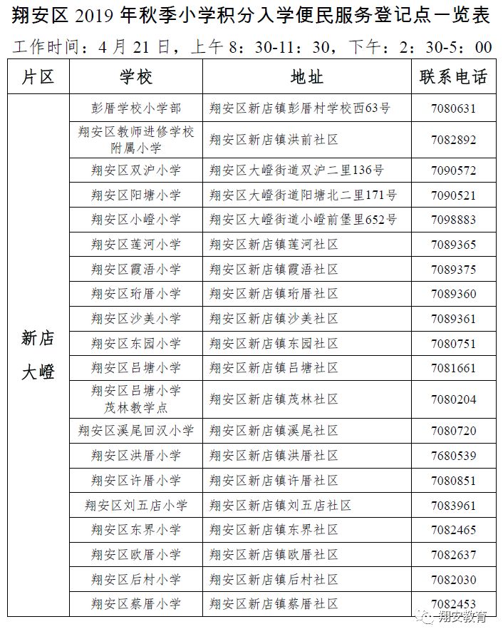 非本市户籍的家长注意啦! 4月17日起 翔安区进城务工人员可申请 随迁子女小学积分入学 具体办法请往下看 ▼ 基本原则 🔸量力而行、尽力而为。以居住地为积分入学片区,全区划分为三个积分入学片区,即新店大嶝片区、马巷内厝片区、新圩大帽山片区,按照国家规定的班生额标准提供学位。 🔸鼓励长期务工。在积分体系中,鼓励随迁子女父(母)在翔安区长期务工。 🔸公开公平。积分入学信息及时公开,接受社会监督。根据学位情况,按照积分高低,遵循志愿,实施电脑派位。 申请条件 ✔年满六周岁(2012年9月1日至2013年8月31日出生)的进城务工人员随迁子女。 ✔随迁子女父母一方持有在有效期内的福建省居住证,当前居住地址在翔安区。 ✔随迁子女父或母一方报名前在翔安区连续居住6个月以上,即2018年11月1日至2019年4月30日必须在翔安区居住。 积分计算方法 随迁子女小学积分入学按 务工社保积分 稳定居住积分 计划生育积分 以上三个项目计算积分 总分120分 ↓↓↓ 务工社保积分(58分) 1. 随迁子女父母一方在工作单位参加厦门市社会保险,累计每满1年积4分,补缴的月份不纳入计算,本项满分为48分;不足整年的按实际月份数计算,计算结果保留两位小数。 2. 随迁子女父母双方均在厦门居住、务工的,可以一方作为主申请方计算积分,另一方作为副申请方。副申请方在厦门参加社会保险的年限累计每满1年积2分,补缴的月份不纳入计算,本项满分为10分。不足整年的按实际月份数计算,计算结果保留两位小数。 稳定居住分(57分) 1. 随迁子女父母一方在厦门居住累计每满1年积2分,本项满分为24分;不足整年的按实际天数计算,计算结果保留两位小数。 2. 随迁子女父或母申请时在翔安区居住且已经在翔安区购买新建商品住房,产权超过50%(不含50%),并已在国土房产部门办理备案登记手续的购房业主,来不及交房入住,必须参加积分入学,可积24分。 3. 随迁子女父母一方居住地与社会保险缴交地都在翔安区,累计每满1年积1分,补缴的月份不纳入计算,本项满分为9分;不足整年的按实际月份数计算,计算结果保留两位小数。 计划生育分(5分) 随迁子女的出生符合计划生育政策的,可到各居住地镇(街)计生办办理计生登记,可积5分(违反计划生育政策生育,无论是否已接受处理的,该项均不得分)。 注意:积分相同怎么办? 总积分相同的随迁子女,依次按以下项目积分进行同分排序:购房、社保年限、居住年限、计生状况。 若按上述项目同分排序后积分名次仍相同的,则按随机的原则排序。 积分入学程序 1 实名注册,网上报名 (4月17日-4月26日) 符合参加翔安区积分入学基本条件的随迁子女在报名前登录“i厦门惠民平台”(www.ixm.gov.cn)或关注“i厦门”微信公众号进行实名注册,并于4月17日-4月26日期间,在“i厦门惠民平台”的“i教育-教育积分”栏目或通过“i厦门”微信公众号进行网上报名,填写准确的个人信息。 逾期未进行网上报名的,均视为自动放弃在我区参加积分入学的资格。 (提醒大家,网上报名前,家长必须在“I厦门惠民平台”进行注册并实名中级认证。实名认证不用等到预约登记平台开放才做,现在有时间就可以先做实名认证。) 个别无上网条件的符合条件的进城务工人员随迁子女家长可携带相关材料,可于4月21日到各便民服务点(请拉到最后查看)参加现场预约登记。 (自行上网预约登记或现场预约登记的,如无疑议,都不必去打印社保和居住信息,只要登录系统,系统就会自动计算出得分。) 2 系统审核,计算积分 (5月31日前) 翔安区教育局会同社会保障、税务、公安、房产管理、卫健等职能部门对申请资料进行审核。 学生家长如对审核情况有异议可于5月31日前通过“i厦门惠民平台”(www.ixm.gov.cn)积分入学平台提出复核申请,逾期不予受理。 3 公布积分试算结果,积分确认 (6月初-6月中旬) 翔安区教育局将于6月中旬前公布积分试算结果及积分确认方式,申请人应及时进行积分确认,逾期未进行积分确认的,视为自动放弃在翔安区参加积分入学的资格。 学生家长如对积分试算结果有异议,可于积分试算结果公布之日起至6月19日24:00前在网上直接申请复查,逾期不予受理。 具体查询时间及查分方式、确认方式请随迁子女家长及时关注“i厦门惠民平台”(www.ixm.gov.cn)的相关通知。 4 公示积分(6月25日-6月29日) 翔安区教育局公示经审核符合条件的随迁子女的入学积分,公示期5天,接受监督。 5 公布学位 (7月18日) 翔安区教育局根据招生计划对全区小学的学位数进行统计核实。 在招收完本区符合“两一致”适龄儿童以及符合政策规定入学的适龄儿童后,结合本区实际,核算出可接收随迁子女入学的小学及其学位数。翔安区教育局将可接收进城务工人员随迁子女入学的小学名单、空余学位数,向社会公布。 6 填报志愿(7月19日-7月20日) 经审核符合积分入学条件的随迁子女的家长应登陆“i厦门惠民平台”(www.ixm.gov.cn)的“i教育-教育积分”栏目填报入学志愿。 家长填报志愿时须按照积分入学片区,即新店大嶝片区、马巷内厝片区、新圩大帽山片区,在同一片区内填满10所志愿学校。 逾期未填报或未按照要求填报10所志愿学校的视为自动放弃在翔安区就学机会。 (因学位紧张,各中心小学、厦门外国语翔安附属学校、第一实验小学、第二实验小学、厦门五缘实验学校翔安分校等