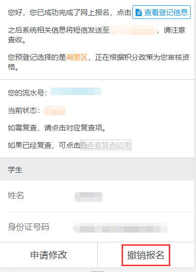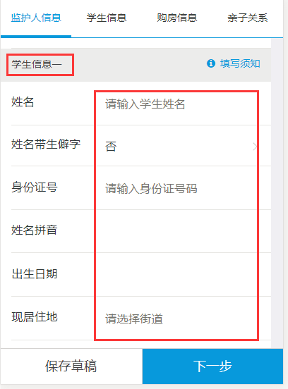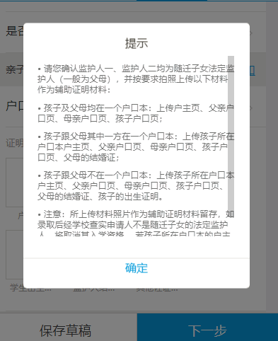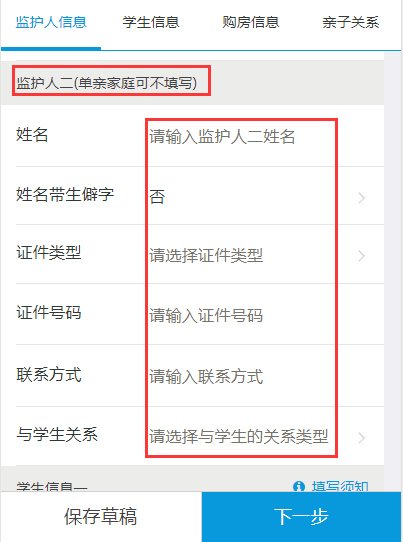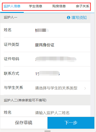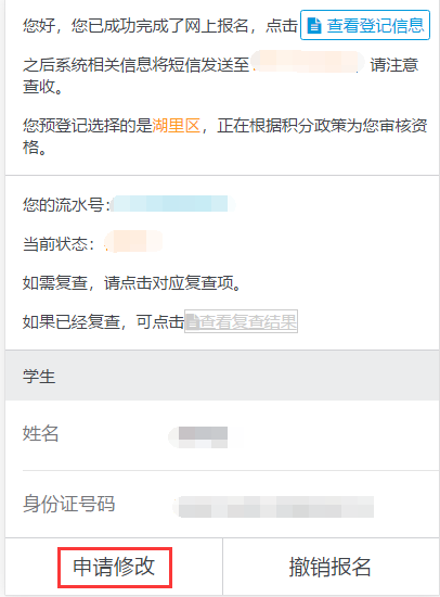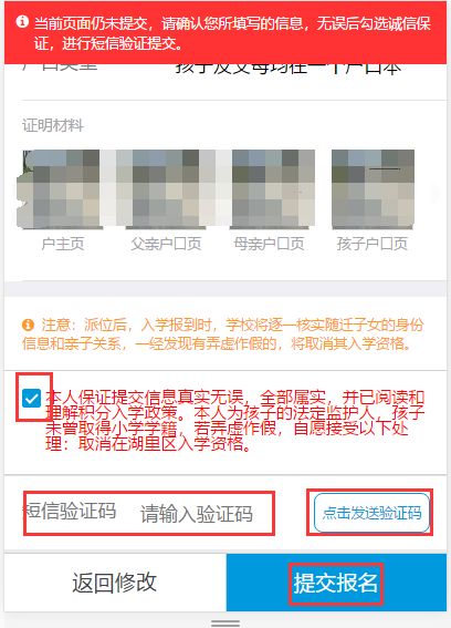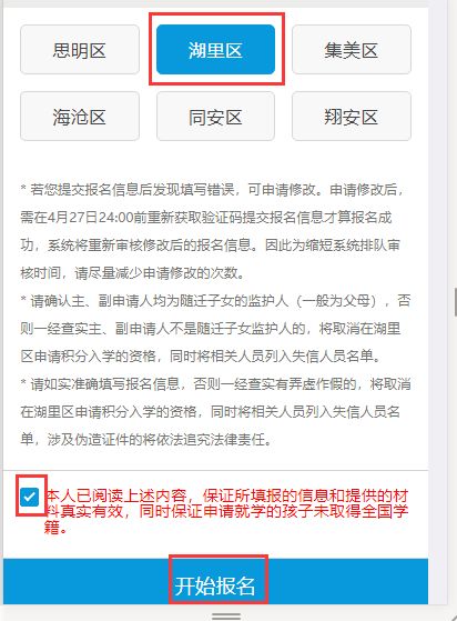 操作指南(手机微信版) 手机微信版报名方式: 1.1注册账号 微信关注“i厦门”公众号,进入公众号,如还未注册i厦门账号,可通过微信端点击“i厦门”进行注册及中级实名认证(图1)。账号应以随迁子女学生家长监护人信息进行注册,切勿使用申请学生信息进行注册账号(图2)。 图1 图2 1.2绑定账号 注册完账号后,点击“用户中心”进行绑定和中级认证(图3)。 图3 点击“个人中心”进行“实名认证”(图4图5),积分入学需要中级认证。 图4 图5 1.3账号绑定后,点击左下角的“掌上服务”(图6),就会出现积分入学的入口,点击“积分入学”进入报名登记界面(图6)。 图6 1.4点击选择“网上报名”(图8),点击“湖里区”,进入“登记声明”界面,认真浏览阅读该声明,勾选下方的保证声明内容,然后点击“开始报名”按钮,进入信息登记界面(图9)。 图8 图9 网上报名登记内容包括监护人信息、学生信息、购房信息、亲子关系四项信息(图10)。请根据实际情况填写。 图10 2.1监护人一 点击“监护人信息”进入“监护人采集界面”,监护人一的信息默认i厦门注册信息,如不完整需补充完整信息(图11)。 图11 2.2监护人二 下拉界面,进入监护人二的信息登记界面,填写规则与监护人一规则一致,如监护人二姓名包含生僻字,选择“是”,需上传身份证正反面信息(图12)。 图12 温馨提示: 1、点击界面右上角的“填写须知”,认真阅读填写须知,有助于您了解该怎么填写信息。 2、监护人如果是厦门市户籍(湖里区户籍除外),需到居住地居委会进行网格化居住登记。 2.3学生信息 2.3.1学生基本信息 填写学生姓名、身份证号,姓名拼音、出生日期是根据填写的姓名与身份证号自动获取的,无需手动填写(图13)。 如果学生姓名带有生僻字,点选“是否带生僻字”,并上传孩子户口页的照片。 如果是多胞胎,需要点击“新增学生”,并新增一条数据(图14)。 图13 图14 2.4房产信息 家长根据实际情况,如湖里区没有房产,选择“否”,然后保存即可。 如湖里区有房产,选择“是”,填写实际的房产信息。填完点击下方的“下一步”按钮(图15)。 图15 温馨提示: 1、已经取得产权证的填写产权证号;新建商品房还未取得产权证的,填写在土房局备案的购房合同编号。 2、若已取得产权,产权证号不要填写“第 ”、“号”、“-1”、“-2”,否则系统无法核查到房产数据; 2.5亲子关系 亲子关系类别,可选择“孩子与父母均在一个户口本”、“孩子跟父母一方在一个户口本”、“孩子跟父母不在一个户口本”三种类型(图16)。不同类别所需上传资料不同(图17-图19)。详细阅读“填写须知”(图20),按实际情况选择正确的类型,准确上传需要的照片。 图16 图17 图18 第一种情况:孩子与父母均在同一本户口本上,需要上传户主页、父亲户口页、母亲户口页、孩子户口页。(图17) 第二种情况:孩子跟父母其中一方在一个户口本,需要上传孩子所在户口本户主页、父亲户口页、母亲户口页、孩子户口页、父母的结婚证。(图18) 第三种情况:孩子跟父母不在一个户口本,上传孩子所在户口本户主页、父亲户口页、母亲户口页、孩子户口页、孩子的出生医学证明、父母的结婚证。(图19) 图19 图20 温馨提示: 1、若孩子所在户口本的户主不是其父母,需上传孩子的出生证明。 2、所需拍照上传材料,只需点击上传图片位置,即可调用手机摄像头,拍照上传。 2.6提交报名信息 填完信息,点击下一步,可以查看所填写登记的全部信息。 认真阅读下方红色字体的诚信保证内容并勾选(图21)。点击“获取验证码”,将收到的短信验证码输入方框内,然后点击“提交报名”,进入审核情况界面,即本次报名成功。报名成功后,系统会生成一个唯一的流水号,家长后期可以登录系统查看所填信息的审核状态情况(图22)。 图21 图22 温馨提示: 1、报名登记是件严谨的事,请认真对待,保证所填信息真实无误。填写登记信息时,请详细阅读页面上所有提示信息,有助于您正确填写信息。 2、报名起止时间为:2019年4月17日至2019年4月26日,请需要报名的学生家长务必在4月26日24:00之前填写信息并获取验证码提交报名信息,否则即视为自愿放弃在湖里区参加积分入学的资格。 3.1申请修改 报名提交后,如填写信息有误,点击“申请修改”,待教育局审核通过后,可对提交材料进行修正(图23);申请修改要注明修改原因(图24)。 图23 图24 温馨提示: 1、申请修改后,请务必在4月26日24:00重新获取验证码提交报名信息才算报名成功。 2、系统将重新审核修改后的报名信息。因此为缩短系统排队审核时间,请尽量减少申请修改的次数。 3.2撤销报名 因个人原因,自愿放弃参加积分入学,可点击“撤销报名”(图25)。 撤销报名需注明撤销原因(原因的文字描述不少于20个字),填写验证码,方可撤销报名(图26)。撤销报名后,即为自愿放弃参加我区2019年积分入学。 图25 图26
