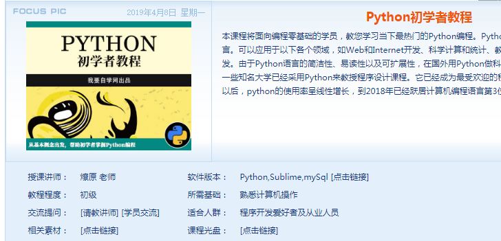 先说我要自学网的,小编是先找到这个《Python初学者教程》教程时间是2018年12月份的,内容还是比较新的,每节8到10分钟,前几章是免费开放,而后面的每节课是2个V币,而如果你要拥有V币,你就需要充值,用人民币去兑换V币。呵,看到币你是不是很熟悉了,就样的付费我相信百分百的学习者都愿意付。