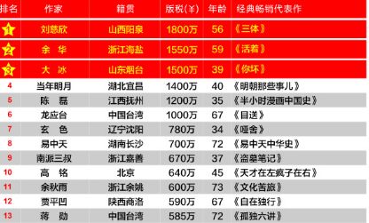 不过刘慈欣这个“作家首富”当得有点名不副实,因为在中国作家榜单列的“童书作家榜”里,他的版税收入甚至进不了前三名。