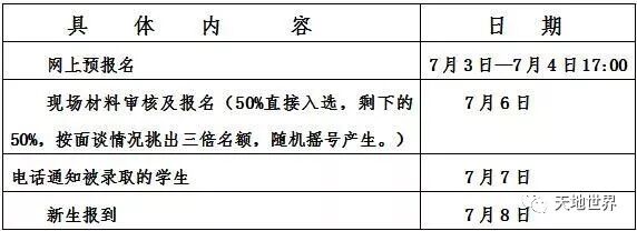 天地学校2019秋季一年级 自主招生开始报名啦! 根据《厦门市教育局关于印发厦门市2019年秋季小学招生工作意见的通知》(厦教基〔2019〕7号)、《厦门市教育局关于印发厦门市进一步做好进城务工人员随迁子女小学积分入学工作指导意见的通知》(厦教基〔2018〕3号)精神,天地学校2019年秋季一年级将继续采取区教育局统筹积分入学招生与天地学校自主招生相结合的办学模式。现将我校2019年秋季自主招生的有关事项通告如下: 自主招收3个班,合计150名学生。 居住湖里区的年满6周岁(即2012年9月1日至2013年8月31日之间出生)的适龄儿童,不受户口所在地限制。 2万元/生/学年。(厦湖发改[2018]22号文) 网上预约报名时间:7月3日-7月4日 现场材料审核及报名时间:7月6日 上午8:00——11:00 下午2:30——5:30 厦门市湖里区天地学校 温馨提示: 家长们在进行预报名前,请先仔细阅读本次报名的关键时间截点。 一年级自主招生报名的关键时间截点 点击文末“二维码,扫一扫”,填写相关信息,完成预报名。 7月5日将公布报名号及材料审核时间段,请及时关注“天地世界”公众号。 1.由一位家长带着入学儿童到学校现场报名,填写登记表,提供相关证件材料。 【需携带物品:户口本原件、湖里区的居住证、黑色水笔1支。】 2.报名流程: 校门口排队>>>查验证件、领表>>>根据编号到相应教室填表>>>面谈 >>>离校。 录取时间:7月8日。 被录取的将电话通知家长,未被录取的不再电话通知。 报名地址: