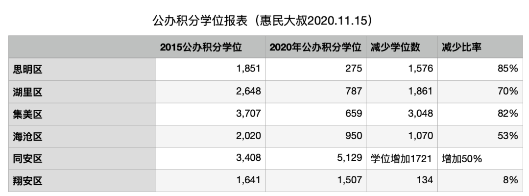 从图中可以看到,思明区、湖里区、集美区给积分入学家长的公办学位大幅下降。海沧区虽然没那么多,但也在50%左右。