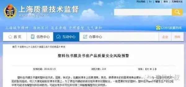上海市质量技术监督局在2月15日发布了《塑料包书膜及书套产品质量安全风险预警》:本次风险监测共采集30批次样品,经检验,25批次塑料包书膜中邻苯二甲酸酯增塑剂项目不符合判定要求,存在安全风险。相关专家称,含邻苯二甲酸酯的软塑料制品,会危害儿童的肝脏和肾脏,也可引起儿童性早熟。专家提醒学生和家长,尽量适用纸质材料包书。