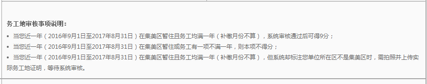 政策上是这么说的:如果主申请人最近在同一个区暂住和务工,可以得9分。岛内是必需最近两年,岛外是必需最近一年。而务工这一项就是社保!