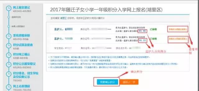 申请人登录报名系统后点击橘色的“积分试算结果”按钮,则会进入到积分试算的界面,系统会分别以两个监护人作为主申请人试算积分,申请人可以点击右侧的“查看积分明细”按钮查看各项积分的明细。