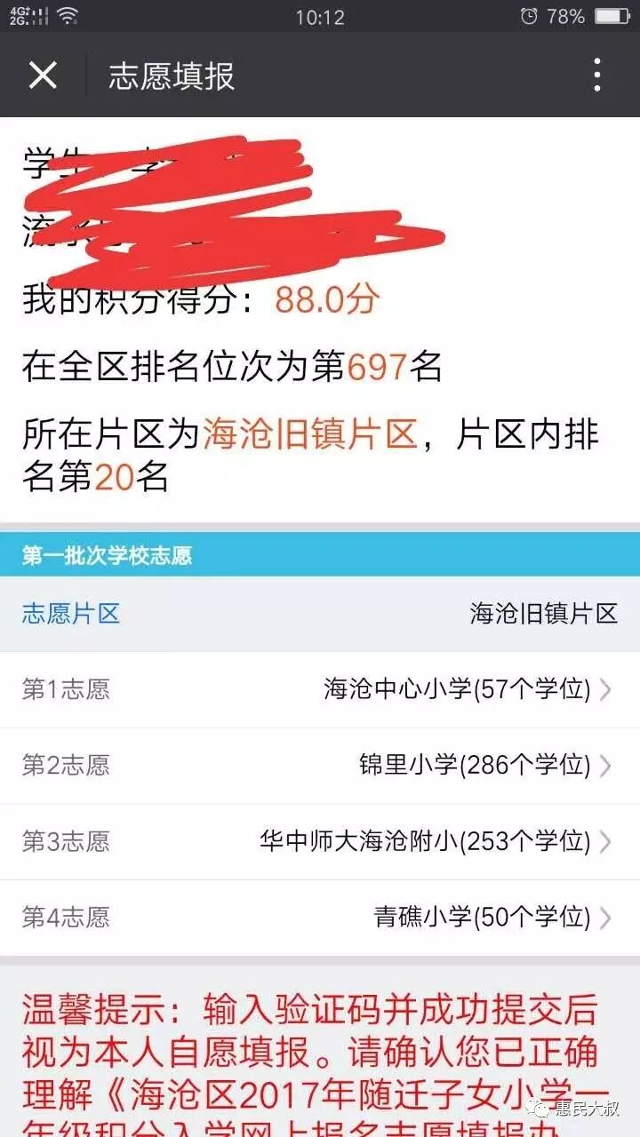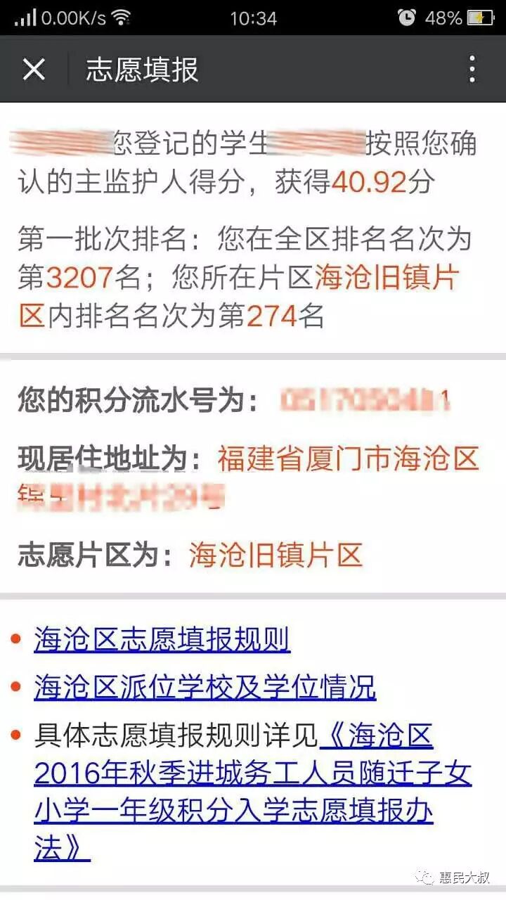 比如,这位家长,海沧旧镇片区排名是20名,旧镇片区646名,那随便填哪个学校,都是可以进的。