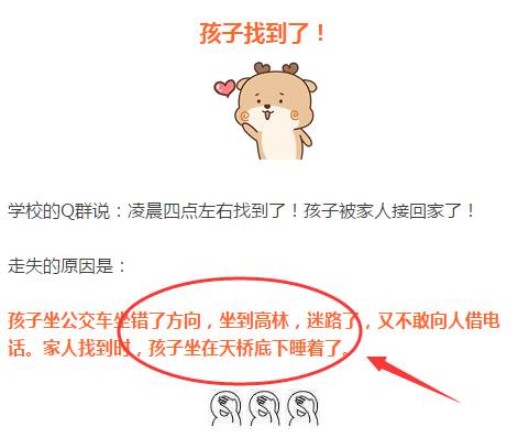 昨天,在群里面有个家长说,有一个六年级的小孩因为问公交车方向坐反了,所以回不了家。从下午5点半左右走丢了,到第二天凌晨4点多才在一个天桥上找到。