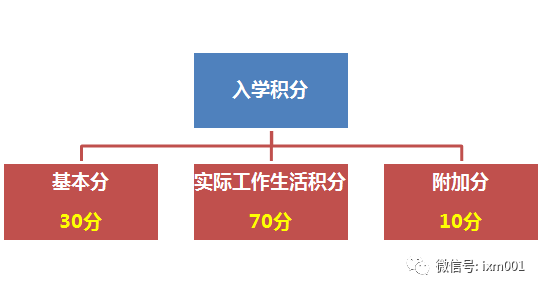 入学积分按照基本分30分、实际工作生活积分70分和附加分10分三部分计算积分。具体积分项目和分值如下: