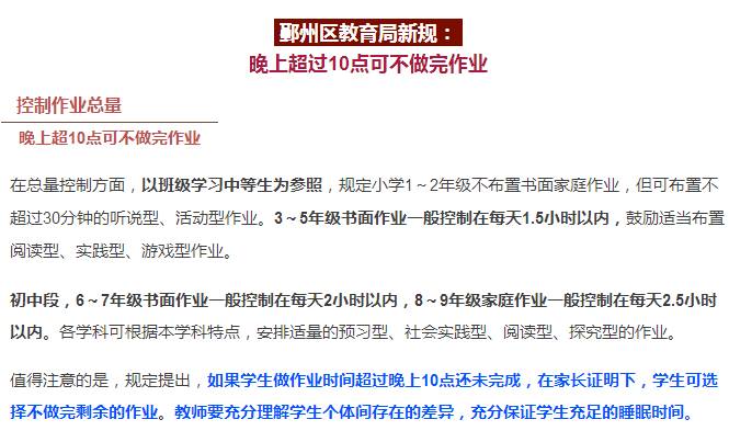 近日,浙江省宁波市鄞州区教育局规定,如果学生做作业时间超过晚上10点还未完成,在家长证明下,学生可选择不做完剩余的作业。
