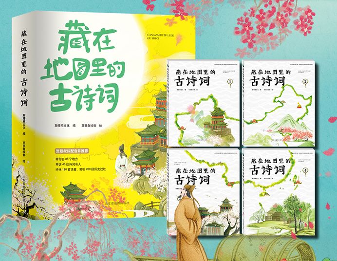 《藏在地图里的古诗词》全套书共四册,以地图为点,以时间为线,带着小朋友乘坐时光列车,穿梭在古诗词的时光地图上。
