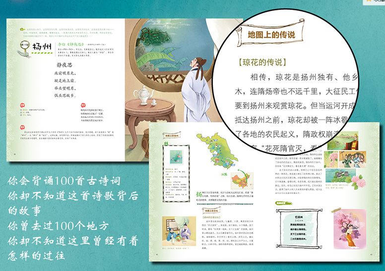 在沉浸在诗歌的美好之中时,用文字与地图、漫画的形式将该地点的详细地理特征、历史传说,名人民俗等进行介绍,生动而有趣!