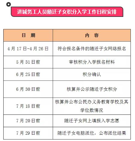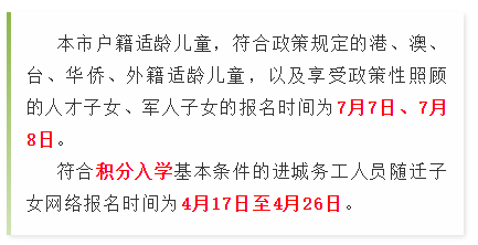 记住了,积分入学是4月17日-4月26日,前后只有10天的时间,比去年少了5天的报名时间,报名宜早不宜迟。当然了,你也有足够的时间让你去准备材料,并且在5月31日前,有碰到不完善的地方还可以提交申请复核修改,争取每一分都是正确无误的。