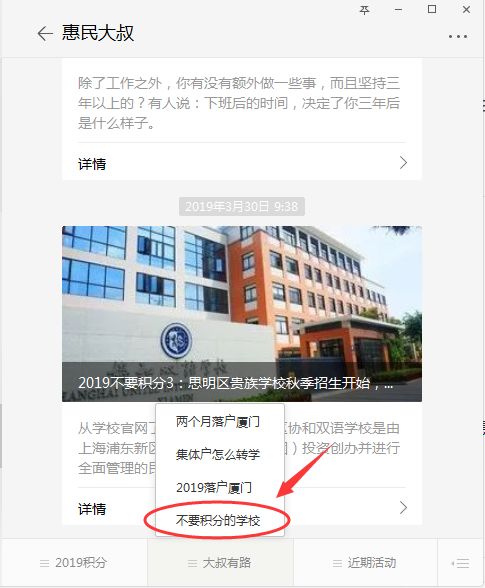 报名时间要记住,是4月8日,也就是下周开始,不限户籍,每个人都可以报名。报名是在学校的公众号报名通道入口那里,惠民大叔截图给你看一下: