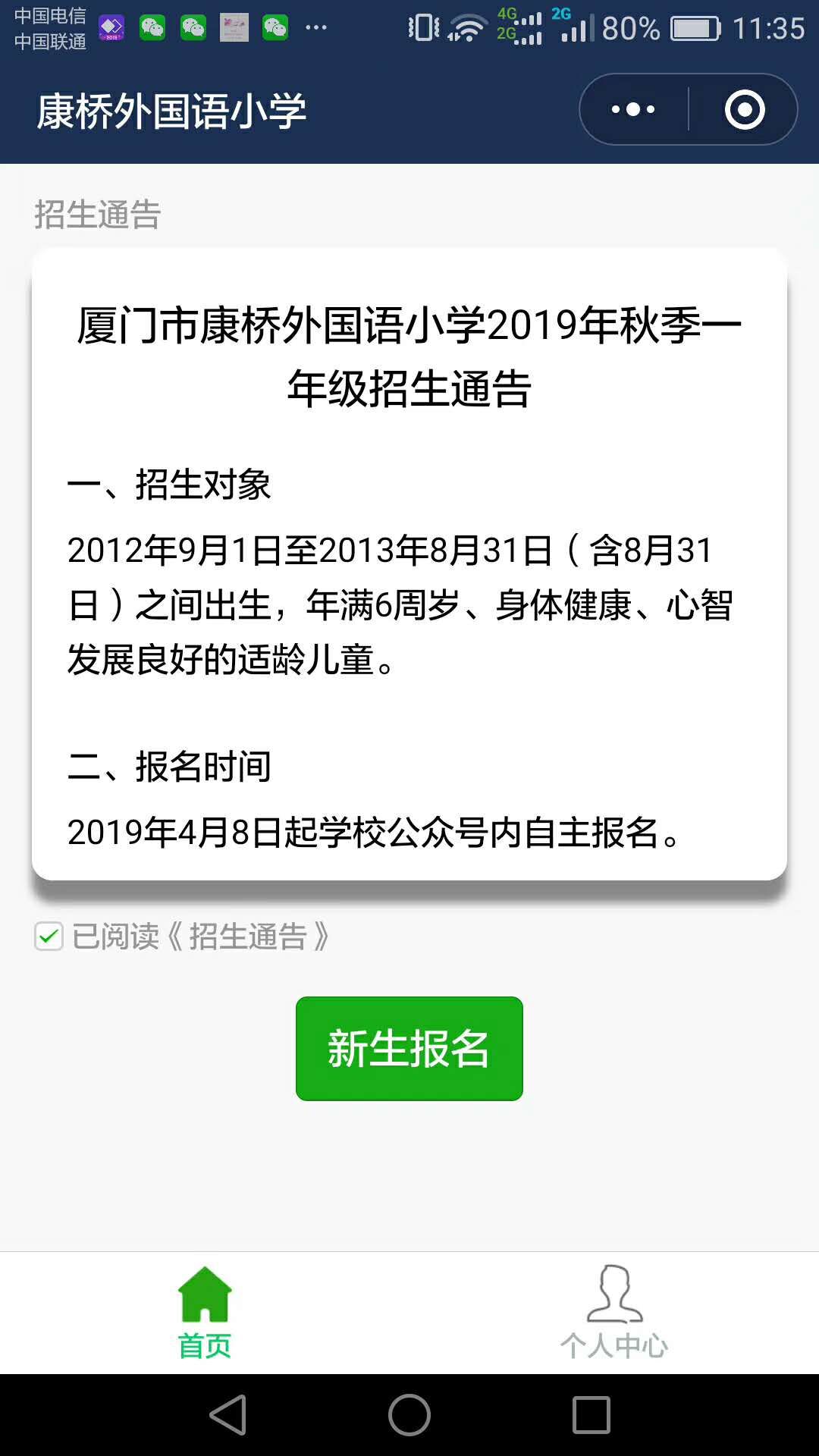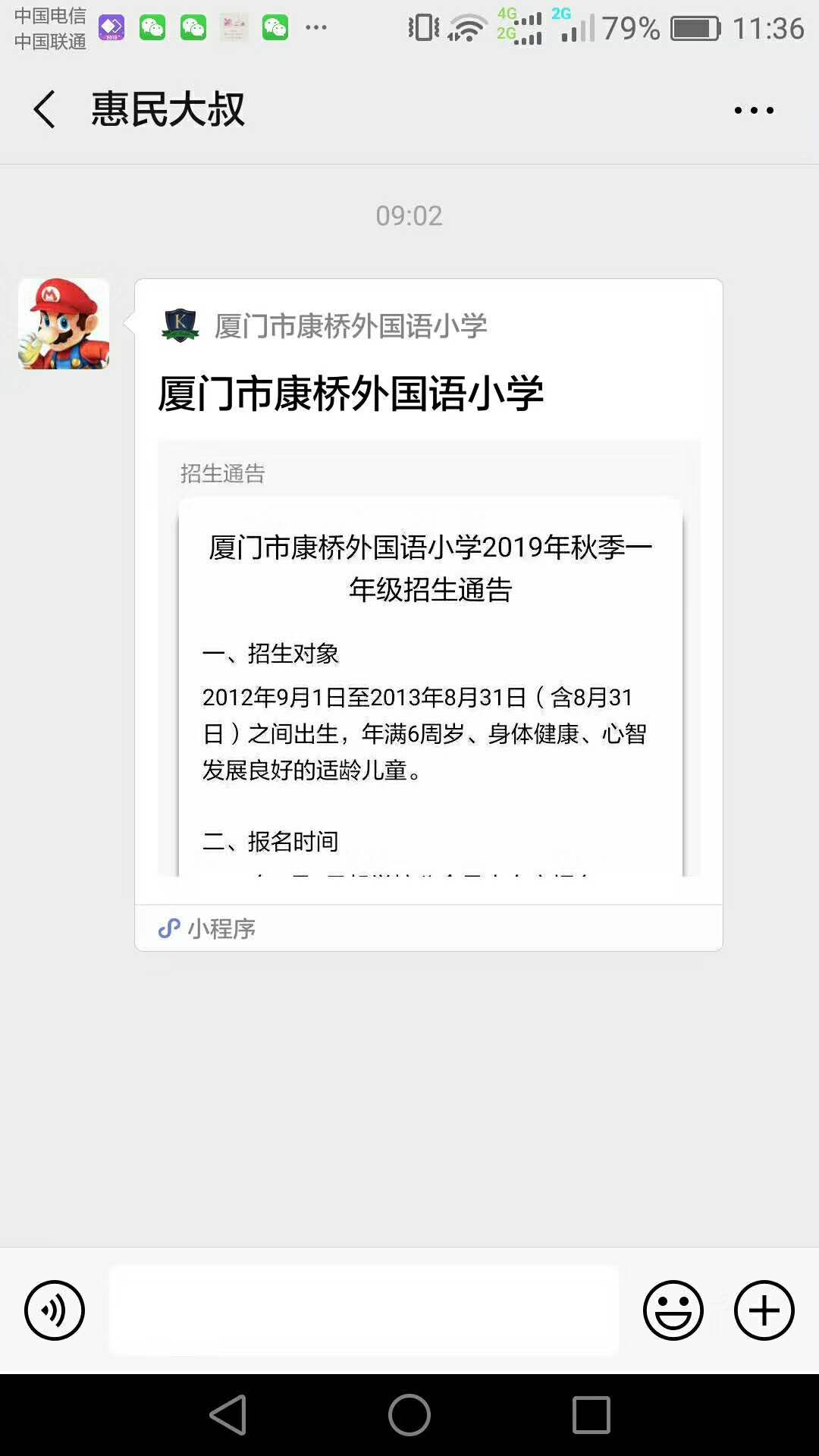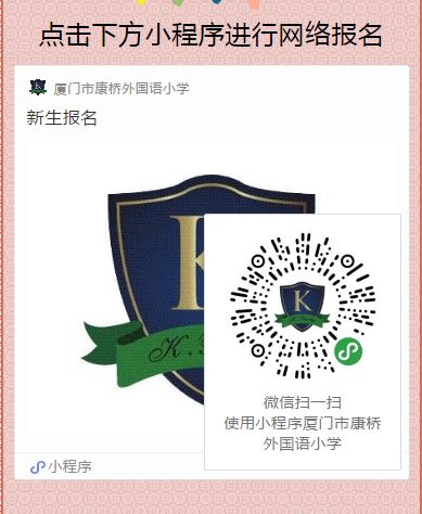 康桥外国语是惠民大叔上周发的招生信息,招生信息上是通过微信公众号报名的,不过这次外国语小学开通的是小程序里面报名,你看下面的这个扫一扫小程序码不能加入。