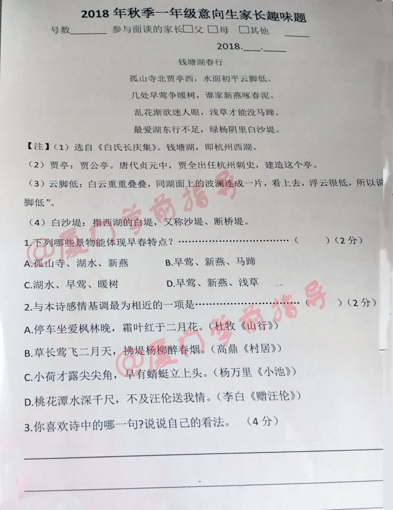 这里要说的是,康桥外国语面谈孩子的时候对家长也是有考试的,去年的考试内容给你看看,大叔看了这些题,有些还真答不上来啊。这估计也会过滤掉一些家长吧。