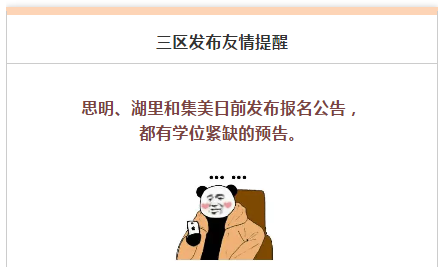 因此,思明区、湖里区、集美区都相应发布了预警提示,招考老师说了,本来厦门每一年的学位都是有限的,又不能设大班制,也不能扩班,学校的班级容量也有限,所以,当三个区的户籍生大幅增长,学位分给户籍生之后,留给积分入学的学位就不多了。