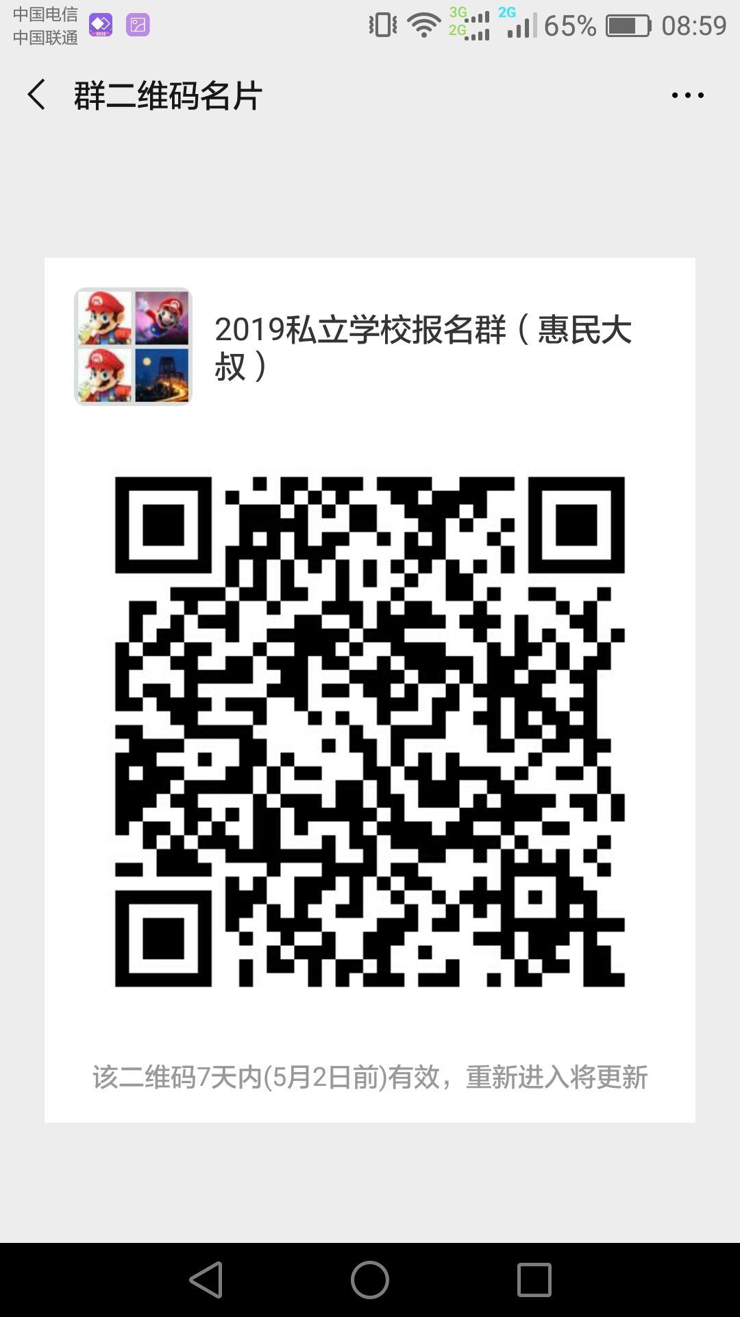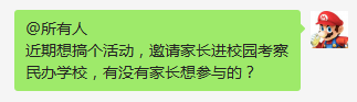 我在群里发了个通告,得到了几个家长的响应,于是就建了一个群,然后呢,看看哪个私立学校愿意邀请我们惠民大叔的家长们去学校参观。这也是大叔做了一个尝试,可能会失败,但为了能解决一些家长的问题,就来试一下吧。