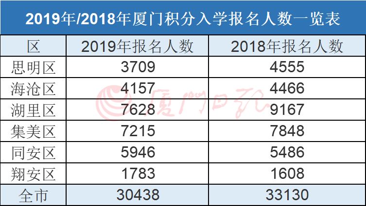 来自厦门招考老师的信息:今年全市积分入学总共报了30438人,比去年少了2000多人。教育部门分析说,报名人数的减少,一个很重要的原因是户籍人口增加了,即户籍政策放开,原本一部分参加积分入学的随迁子女落户了。