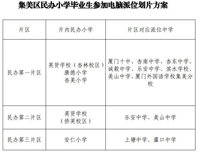 3、如果是集美户口的一般按户口进行划片招生,如果是非集美户口的符合派位的公办小学学生对应派入片区的中学。以下是厦门招考发布的划片地址表,你可以点击放大来看: