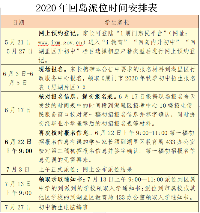 6月22日上午9:00-11:00第一稿初招报名信息有误的学生家长须到湖里区教育局433办公室校对第二稿初招报名信息并签字确认。第一稿初招报名信息无误的无需再来。