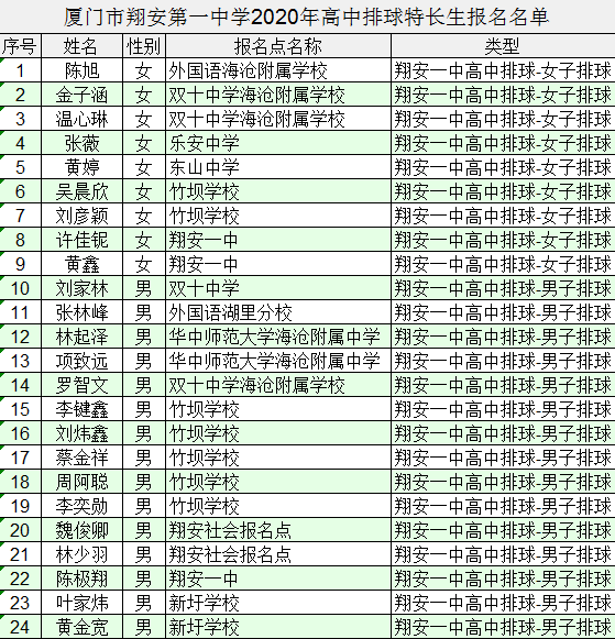 2020年厦门市翔安第一中学高中排球特长生报名名单