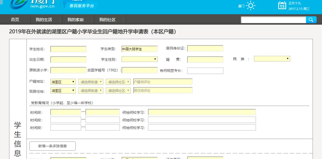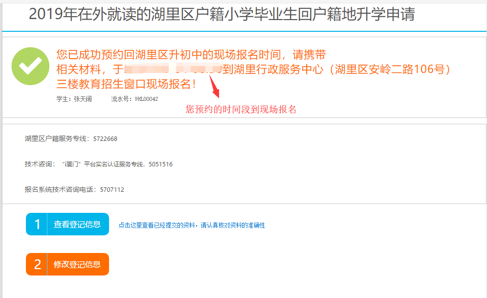 湖里区户籍在外就读的小学毕业生 回湖里区升初中 网上预约该怎么操作? 这份最详细的指南赶紧来看看 在浏览器输入http://www.ixm.gov.cn/进入i厦门官方网站首页,点击右上角登录,填写已注册的账号、密码、输入图行验证码点击登录按钮。 登录i厦门之后 在首页搜索框下面找到“i教育” ▼ 然后点击“回岛内升初中” ▼ 再选择“回湖里区升初中” 注意选择正确的区填报 ▼ 1.进入回湖里区升学申请信息填写界面,可以看到“本区户籍适龄儿童”“港澳适龄儿童”“台湾适龄儿童”“华侨、外籍适龄儿童”四类户籍类型。选择对应的户籍类型进入并填写相关信息。 2.内容填写。主要填写学生基本信息、受教育情况、监护人信息、申请理由,最后选择现场报名预约时间。 3.如果申请回户籍地的学生信息不止一个,可以点击“新增一条多孩信息”,添加一个学生的基本信息和受教育情况。特别提醒:华侨、外籍适龄儿童需要选择国籍。 4.选择预约时间,选择时间段,如果该时间段显示灰色,表示该时间段已经预约满了,选择另外时间段预约。如所有预约时间段已经预约满了,请于5月30日-5月31日(上午9:00-12:00,下午1:00-5:00)直接到现场取号办理。 5.填写完信息之后可以提交报名信息,提交成功之后会显示预约成功的界面,请注意阅读文字内容和预约时间,不要错过。 6.“申请修改”如果发现信息填写错误,点击下方的“修改登记信息”进行修改。 修改完后务必重新“提交登记”。 大家都学会了吗? 更多相关消息,请看我们的上一条推送哦~