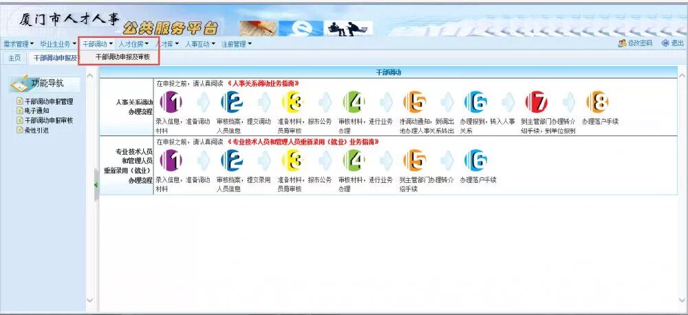 (一)登录厦门市人力资源与社会保障局对公综合服务平台 (二)单位账号密码登录(个人账号密码不行) (三)进入系统后,找到【干部调动】-【干部调动申报及审核】 (四)点击【干部调动申报管理】,点击【新增】按钮,填写认真准确的填写完相关资料。 注意:工作经历请填写档案经历(档案所在地人事代理时间记录的工作经历)最终人社对的是这个,而非实际工作经历。 (五)填写完整后,点击【打印】按钮,将审批表正反面打印在同一张纸上,打印一式三份。有随迁人员《调动登记表》也需打印。 (六)审批表盖章 1、在审批表上盖调入单位意见章:盖申请单位公章(目前就职并且连续缴纳社保单位) 2、在审批表上盖调出单位意见以及调出单位主管部门意见章:即档案保管的人才市场的章 (七)前往厦门/各区人才市场(看自己公司档案在哪里代理就去哪里) 2、前往人才市场,开《调档函》 (八)带上《调档函》前往目前档案保管人才市场,人才市场会将档案发往厦门人才中心(公务员局)审批(承诺6天,短信通知) (九)厦门人才中心开具《企事业单位人事关系调动通知》注意通知上的日期提示,切勿超时 (十)将《企事业单位人事关系调动通知》给原来档案所在地人才,开《人事关系介绍信》。若《人事关系介绍信》已经取消,则直接前往厦门人才中心 (十一)厦门市人才中心批件(携带前面所说材料) (十二)前往厦门行政服务中心户政处(取号办理) 携带前面所述材料 福建省内户口:网上迁移,三个工作日以后直接去集体户/房子所在派出所办理落户 外省户口:拿到《准迁证》以后,将其中一联寄回老家,请人去户籍派出所代办或者自己前往办理。